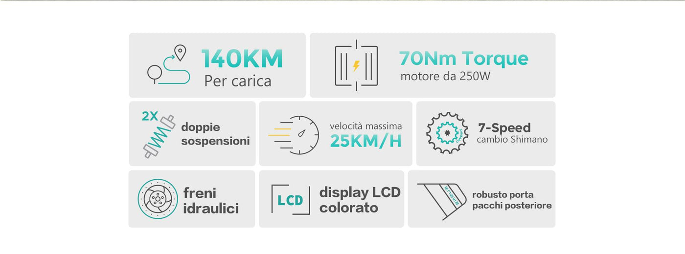 - Velocità massima: 25KM/H (la velocità effettiva varia a seconda del peso del ciclista e delle condizioni della strada)