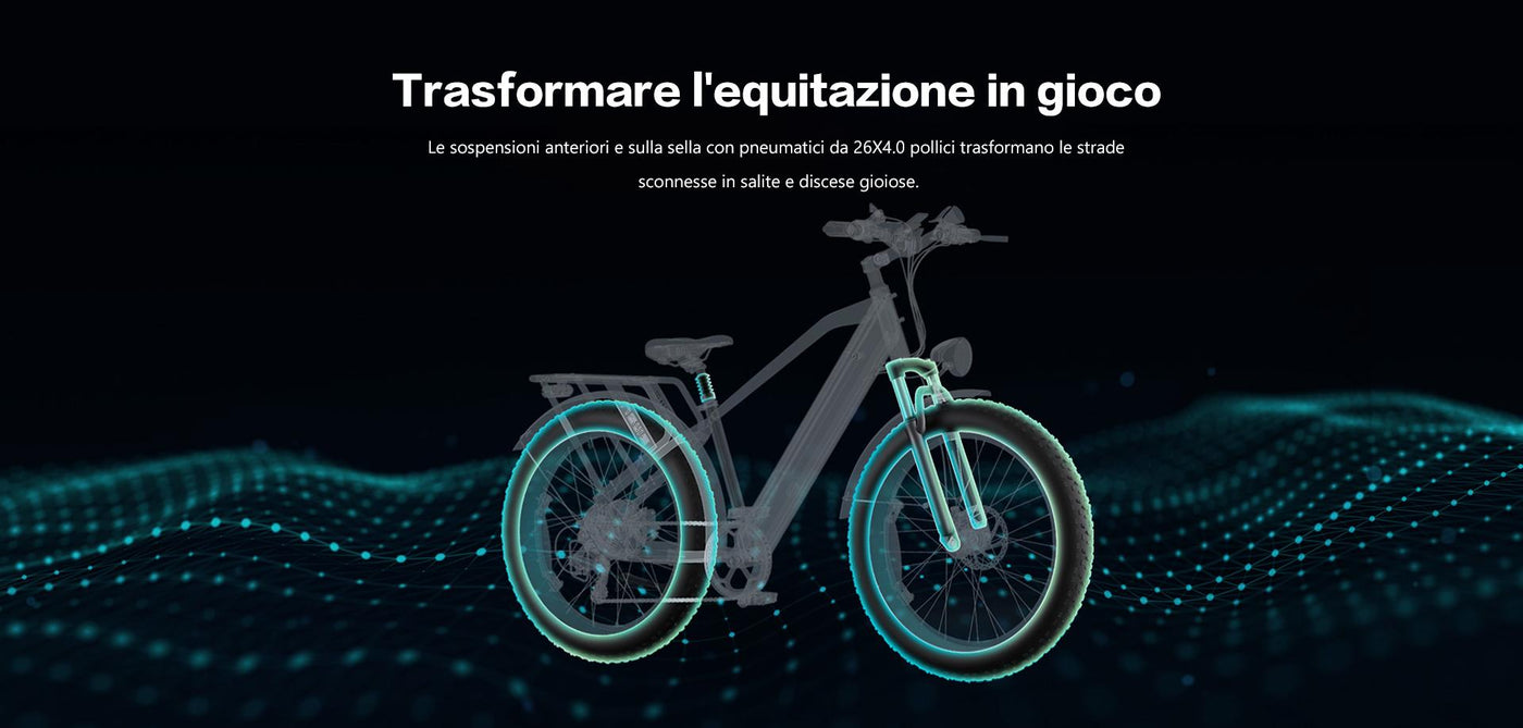 Bicicletta elettrica ENGWE E26 con motore da 250 W, autonomia massima di 140 km, doppia sospensione, bici elettrica adatta a tutti i terreni, cambio Shimano a 7 velocità, velocità massima di 25 km/h, pneumatici Fat da 26*4,0 pollici, carico di 150 kg, freno a disco idraulico.