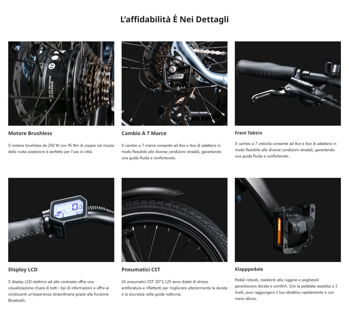 Le bici elettriche pieghevoli possono essere facilmente riposte a casa, in ufficio o in altri piccoli spazi senza occupare troppo spazio. Inoltre, una volta piegate, sono facili da trasportare, sia in autobus, in metropolitana o nel bagagliaio di un’auto, il che è molto comodo. Questo rende gli spostamenti più flessibili: ad esempio, è possibile raggiungere una fermata dell’autobus o della metropolitana, piegare Ace e trasportarla sull’autobus, per poi ripartire una volta arrivati a destinazione, risolvendo il problema dell’”ultimo miglio”.